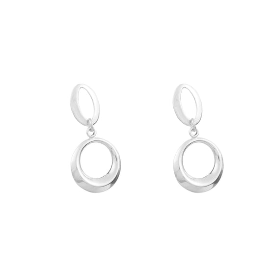 Aretes de plata .925, conformados por óvalos en la parte superior, de estos cuelgan, en la parte inferior, circulos de mayor tamaño. Un diseño minimalista y elegante.