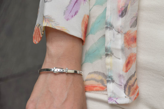 Un diseño inspirado en la elegancia de los detalles cotidianos. Esta pulsera rígida recrea la forma de un cinturón, fusionando simplicidad y carácter en una pieza única. Su hebilla funcional y líneas limpias evocan un estilo moderno, perfecta para llevar sola o acompañada.