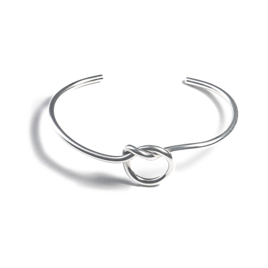 Un símbolo sutil de unión y equilibrio. Esta pulsera abierta se distingue por su delicado nudo central entrelazado con un aro, creando una composición elegante y moderna. Su forma limpia y fluida le da un aire minimalista que resalta por su armonía visual.