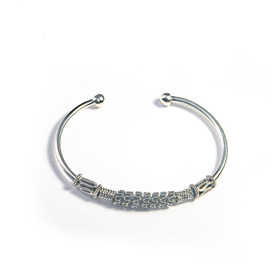 Un equilibrio perfecto entre elegancia y carácter. Esta pulsera rígida de plata .925 cautiva con su estructura abierta y detalles artesanales que la convierten en una pieza única. Su diseño combina elementos geométricos con delicados hilos de plata entrelazados, creando un efecto sofisticado y lleno de textura.