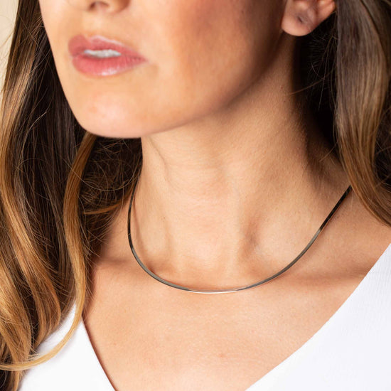 Gargantilla elaborada en Plata ley .925, además de ser elegante, fina y resaltará y acentuará las cualidades propias de tu cuello. 13.5 cm de alto, 2 mm de espesor, 12 cm de ancho
